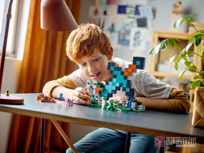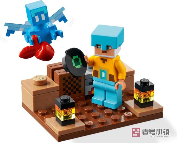 孩子们可以在山坡上拼搭一座巨型的钻石宝剑基地,并守卫基地,抵御敌对生物的攻击。基地中有桌子、饼干,以及一个可以“播放”唱片的自动点唱机。在基地外面,哨兵和守卫士兵在站岗放哨。基地的前面还提供了加强火力:2 个发射器。敌对生物包括爬行者和骷髅。友好的生物有猪和带有箔翼的轻灵。警戒塔底部的控制杆可以触发爆炸,使一部分建筑倒塌。如想体验额外的数字化乐趣,可尝试 LEGO Builder 应用程序,其拥有直观的缩放和旋转工具,允许孩子们在拼搭过程中查看他们模型的数字版。