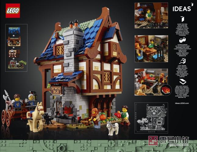 摆脱繁忙的现代生活,来拼搭这款乐高®创意 LEGO® Ideas 中世纪铁匠铺 (21325) 展示模型。我们以可爱的乐高方式重现了一座中世纪 3 层建筑的细节。屋顶和上面两层可以取下,以便欣赏布置有家具的卧室和厨房,以及铁匠铺,里面放有在真实中世纪铁匠铺中见过的物品。其它功能和特色包括带有乐高发光积木的锻造炉和一个院子,后者布置有可拼搭的苹果树和水井。 小人仔及其它配件 本套装包含 4 个小人仔,可将逼真场景鲜活呈现:铁匠、弓箭手、2 名黑鹰骑士 (Black Falcon Knight),他们配有 4 把宝剑、3 面盾牌和一支戟,还包含拖着可拼搭式马车的灵活马儿、狗和树蛙。 时尚礼物 这款拼搭组合属于系列富有启发性的乐高套装,旨在帮助成人以具有创意的方式进行休息。可作为自己或周围乐高粉丝(或爱好者)的一份超棒礼物。