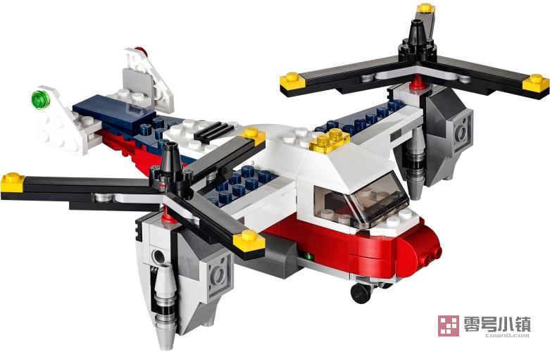 这架双螺旋桨飞机具有名副其实的革命性!旋转转子叶片便可像直升机一样起飞。然后旋转引擎 90 度,向飞机一样开足马力前进,同时由双尾翼确保机身的稳定。凭借红白相间的色调和引擎排气细节,这架双螺旋桨飞机即使在高空也很容易识别。回到地面上后,使用滑坡道接上货仓。如果您渴望新的挑战,可以将其改造为老式的双翼飞机或高速直升机。