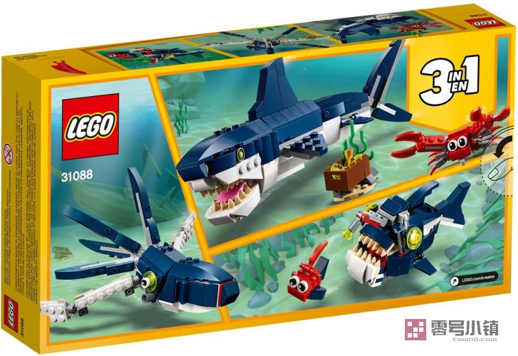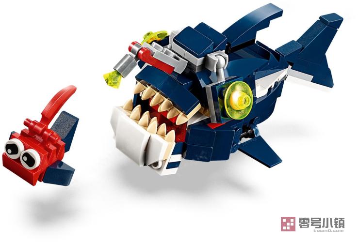 玩乐这款乐高® Creator 3 合 1 31088 深海生物套装,体验激动人心的深海生物大冒险,本套装包含一只可怕的鲨鱼和一只守护宝箱的灵活螃蟹,其中鲨鱼采用了仿真的深蓝色和白色配色方案,它可张开的大嘴中满是尖尖的牙齿,还带有可活动的鳍、可活动的身体关节和反光的眼睛。通过这款乐高 Creator 3 合 1 积木套装,你可以获得 3 份不同的拼搭和玩乐体验。拼搭鲨鱼和螃蟹玩具,然后把它们重新拼搭为一条灵活的鱿鱼或者一条大嘴巴的琵琶鱼,获取更多的深海欢乐。