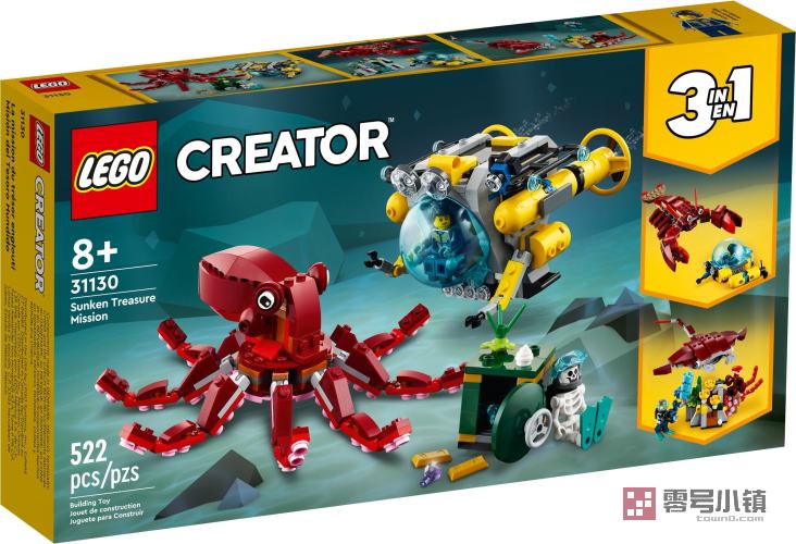 玩乐这款趣味十足的乐高® Creator 3 合 1 系列寻找沉没的宝藏 (31130),8 岁及以上的孩子可以进行精彩刺激的水下大冒险。这款玩具套装包含一艘超酷的潜艇、一个肢体灵活的巨型章鱼、2 个小人仔,以及装有金条和宝石的保险箱