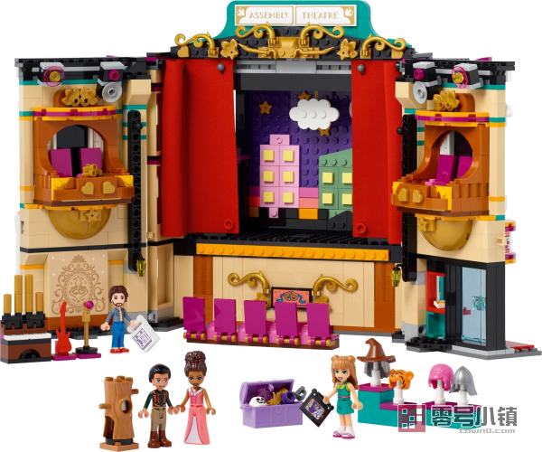 可以打开维多利亚式正面,显露出剧院,以及管弦乐队座位和包厢座位。拉开剧院的织物幕布,露出 2 块背景幕布——一块是中世纪城堡,另一块是夜间城市景观。可以将剧院转一圈,后面有照明设备、可供角色们化妆的更衣室,就像真的剧院一样!这里还有玩具道具,以便孩子们创造属于他们自己的戏剧场景。乐高®好朋友安德里亚、奥利和弗雷娅可以在艾德里安教授的指导下表演不同的角色。