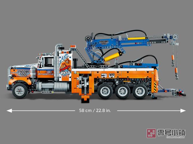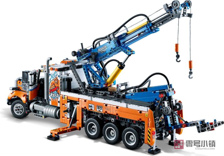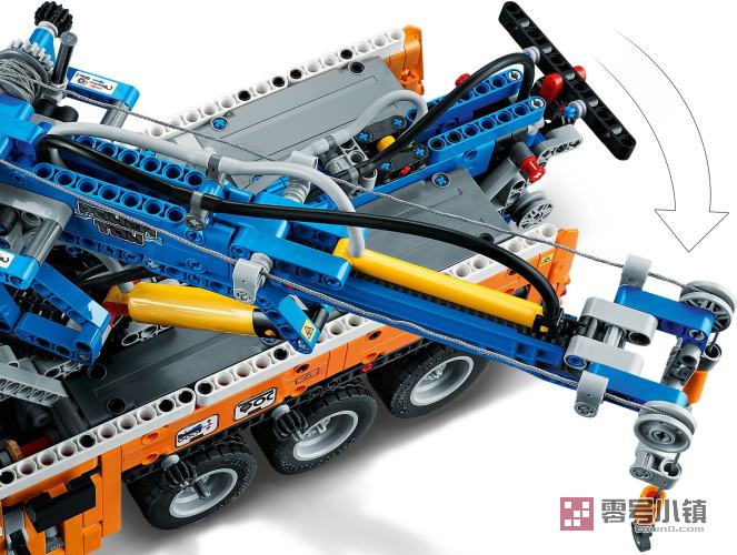 这款带有吊车的拖车玩具充满激动人心的功能。打开引擎盖,可以看到直列 6 缸引擎,其带有可以活动的活塞。可通过旋转顶部的销钉进行转向。可以启动吊车,通过气动装置驱动吊杆,拉出绞车,以及伸出支架。这是乐高机械组历史上第一次:这款机车配有提升轴,可以拉下额外的车轮,分散负载的重量。