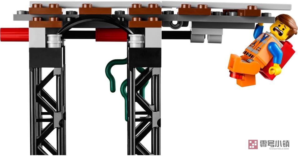 坏警察驾驶飞行警车沿铁路轨道追赶Emmet,上演一部高速动作片。从坏警察警车的引擎盖下抽出激光器,发动隐藏在门下方的激光炮。小心摇摇欲坠的铁路桥!坏警察发动了新式爆裂器,还有能活动的机器鳄鱼,拥有能闭合的巨颚以及背部的警灯,都在下面等着,这些更加麻烦。在Emmet似乎在劫难逃时,转动坏警察的头,将其转化为好警察!包括 2 个小人仔及武器和各类配件:Emmet和坏警察。