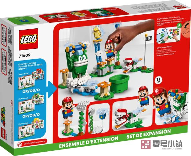 玩乐这款大加邦云端挑战扩展关卡 (71409),孩子们可以创造他们专属的乐高®超级马力欧空中关卡。它包含源自电子游戏《超级马力欧》的熟悉挑战以及 3 个人们熟知的反派角色的乐高人偶:大加邦、回旋镖兄弟和吞食花。玩家可以通过许多行动赚取数字金币,如帮助乐高®马力欧、乐高®路易吉或乐高®桃花公主人偶(本品不含)对战大加邦,跳上橙色的蘑菇跳跳床以靠近回旋镖兄弟,使用无敌星砖等。(注意:进行游戏时需要用到入门套组 71360、71387 或 71403。)