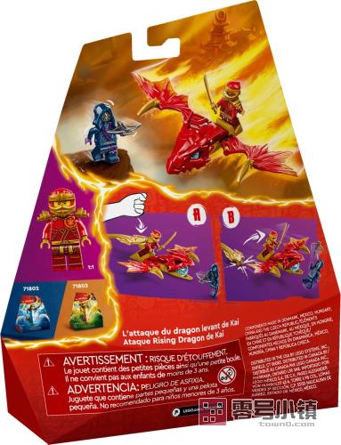 这款玩具套装包含 2 个小人仔:配有武士刀的飞龙凯和装备有十字弓的恶狼面具守卫,其中凯可以骑乘积木拼搭的神龙。孩子们可以上演乐高幻影忍者角色之间的战斗,赢取神龙口中的蓝色神龙力量组件。