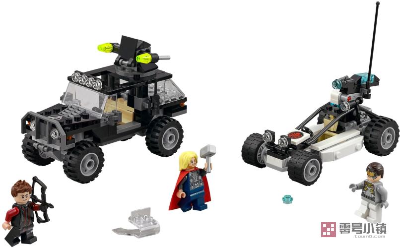 加入雷神托尔和鹰眼的队伍,在Sokovia 的凛冬森林中追捕九头蛇的爪牙!让鹰眼坐进复仇者酷炫四驱战车的驾驶座,点燃引擎急速前进。一旦发现九头蛇的越野车,立即发射旋转式炮塔的轻型导弹,同时左右闪避,躲开越野车火力密集的射钉枪攻击。然后启动雷神托尔驾驶的超级跳跃器,瞄准目标弹射,一次性摧毁射钉枪!包括 3 个小人仔及各类武器和配件:雷神托尔、鹰眼和九头蛇爪牙。