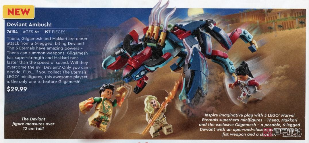 当一个 6 条腿且可以撕咬的异常者对 3 个永恒族(希娜、吉尔伽美什和马卡里)发起攻击时,孩子们必须运用自己所有的超级英雄技能来帮助他们。借助 3 个超级英雄小人仔,孩子们可以想象着运用他们的超能力:希娜召唤搏斗武器的能力,吉尔伽美什的超强力量,马卡里的惊人速度。如果你正在为一名小人仔粉丝选购礼物,那么这款超棒的乐高玩具套装是唯一一款包含吉尔伽美什小人仔的套装!