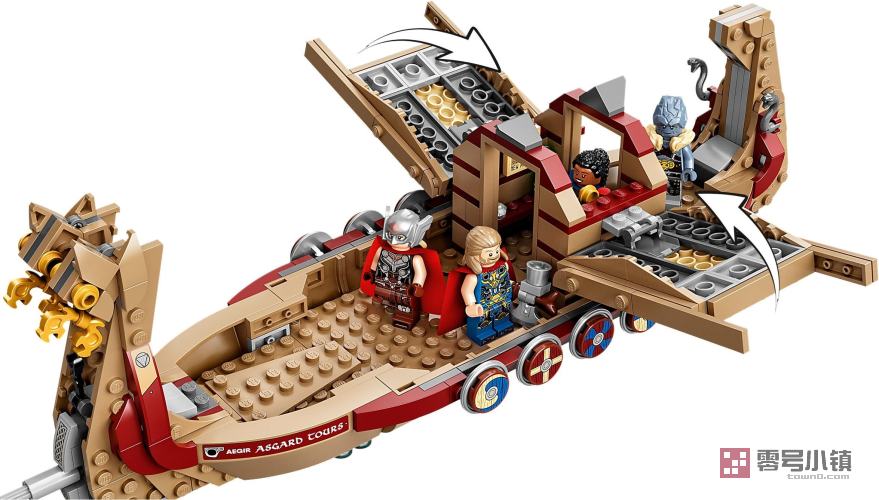 这艘大船由传说中的山羊 Toothgnasher 和 Toothgrinder 拉着在空中飞行,两只山羊已被抬离地面以便孩子们在玩乐中推动大船。这款套装包含 5 个小人仔:雷神托尔、女雷神、瓦尔基里、寇格和格尔,以及一系列武器和配件,其中包括雷神托尔的旋风斧。中部船舱拥有可以打开的顶篷,以提供更多游戏空间。系列逼真的配件能够进一步启发创意游戏,其中包括船用扳手、灭火器、新阿斯加德地图、瓶子和太阳石。当一天的超级英雄冒险结束时,孩子们可以把这艘船展示在他们的房间中。这款免费的乐高拼搭说明应用程序包含直观的数字可视化工具,其具有缩放和旋转功能。