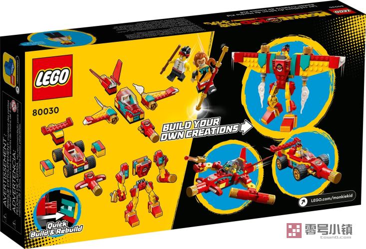 借助这款乐高®悟空小侠:悟空小侠百变箱 (80030),向孩子们讲述有关孙悟空的神奇故事,带领他们领略乐高®拼搭和玩乐的乐趣。这款交通工具玩具套装包含可拼搭的机甲、赛车和飞机,每个模型都包含易于拼搭的组件,所以孩子们可以把这些模型混搭在一起,创造属于他们自己的独特作品。这款套装包含 2022 年 1 月新推出的小人仔:身穿训练服饰的悟空小侠和手持金箍棒的孙悟空,可以启发故事讲述和角色扮演活动。本套装可作为 5 岁及以上孩子的超棒礼物或奖励。