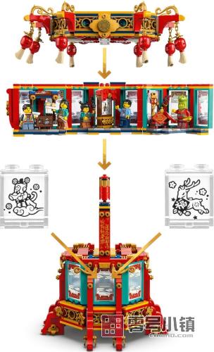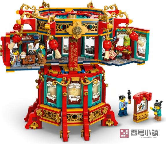 这款灯笼还被设计成一款具有启发性的角色扮演玩具,非常适合喜欢创意的孩子。灯笼的顶部可以拆离,以便查看顶层(也可以拆离),后者可以展开,显露出 3 个节日场景:可以拼搭的美食摊、装饰品摊和皮影戏。这款套装还包含 5 个小人仔:2 个成人、2 个孩子和一个穿着蛇年服装的角色,可供进行角色扮演。